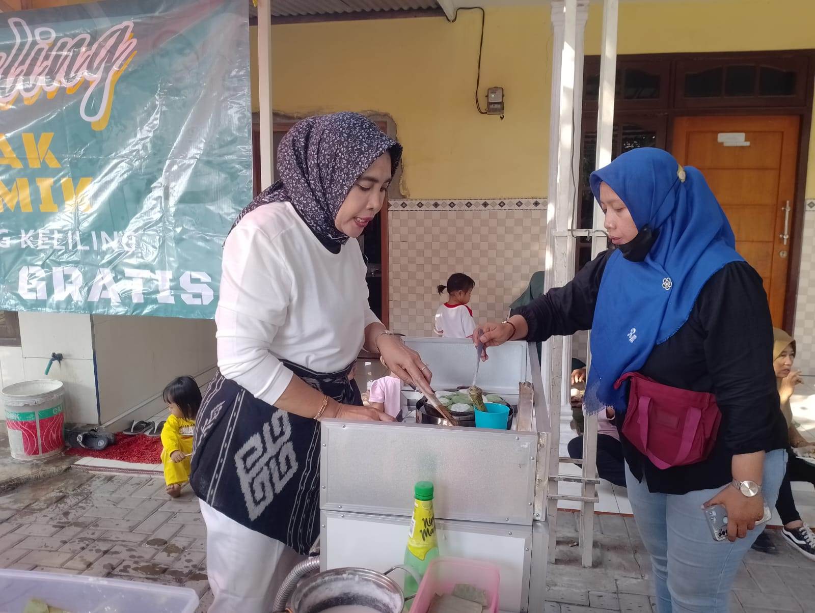 Didampingi timnya, Warung Keliling gratis serta Rawon Bok Legi, Mimik Idayana juga ikut makan bersama warga di sana.