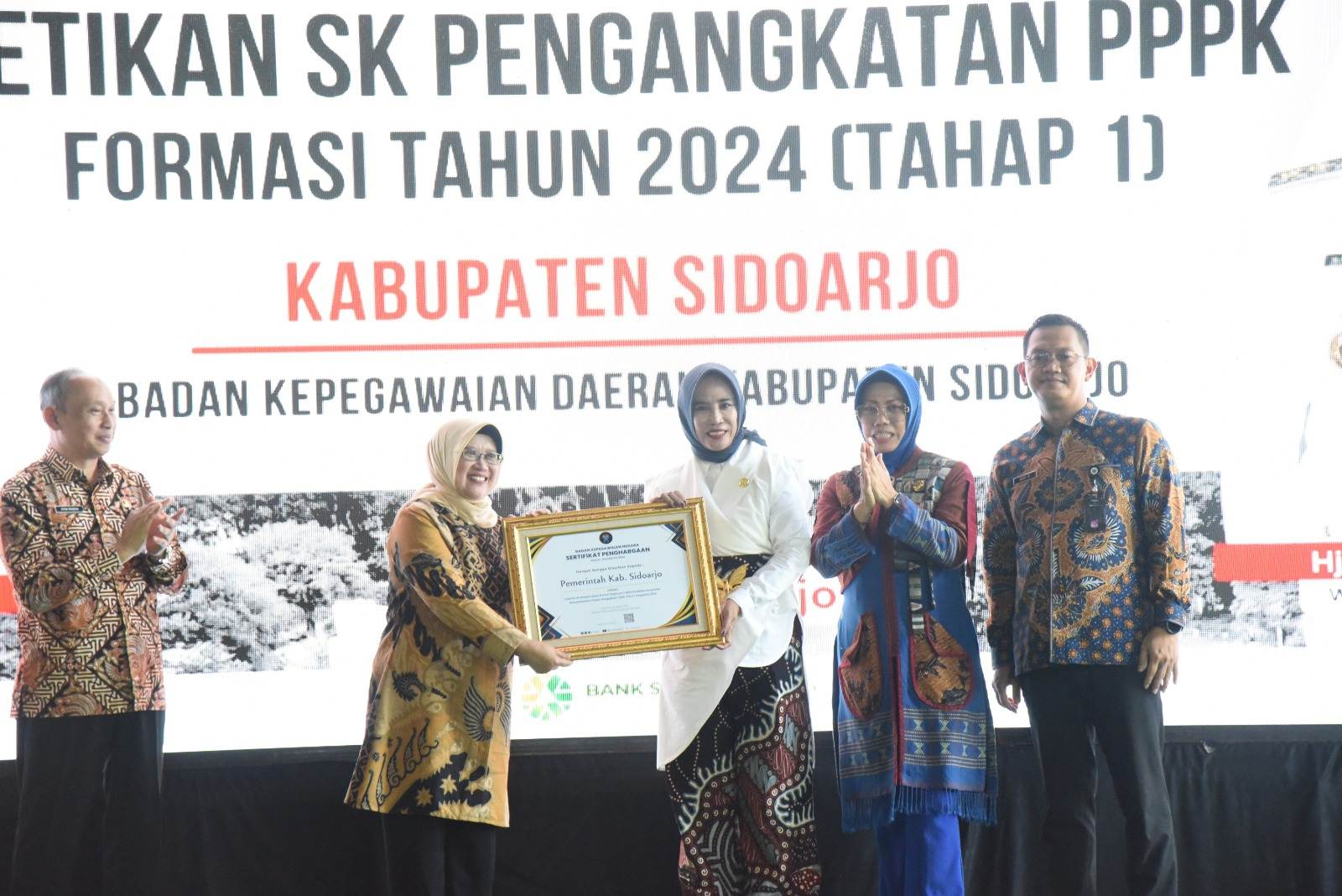Selasa (29/4/2025), petikan SK tersebut diserahkan secara digital oleh Wakil Bupati Sidoarjo Mimik Idayana di Resto Jie Poek DW Resto Sidoarjo. Para ASN PPPK mengunduh SK pengangkatan masing-masing melalui aplikasi myasn.bkn.go.id.