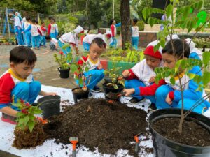 Beberapa siswa memindahkan tanamannya yang semula di polibek, dipindahkan ke pot yang lebih besar, serta menambahkan tanah dan pupuk, tak lupa mereka juga menyiramnya, yaitu pohon belimbing, klengkeng, jambu air, nangka, rambutan, dan lain-lain. Jenis tanaman toga antara lain: kunyit, laos, sere, suruh merah, dan pandan.