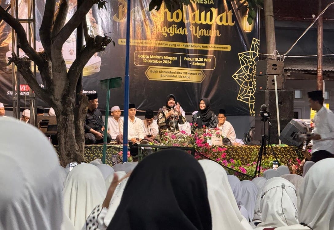SIDOARJO, Dinamikajatim.id-Calon Gubernur Jawa Timur, Tri Rismaharini menghadiri acara pengajian memperingati Milad ke-4 Moonzaya sekaligus Maulid Nabi Muhammad SAW di Desa Blurukidul Kecamatan Sidoarjo, Sabtu (12/10/2024) malam.